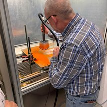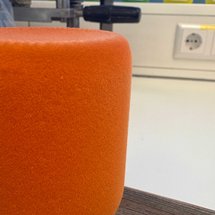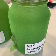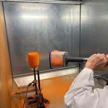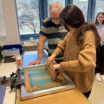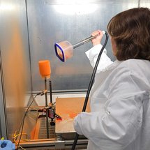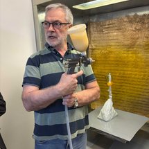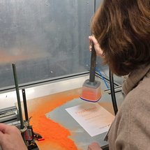Am zweiten Tag fand wie immer der praktische Teil unseres Workshops statt. Hier duften alle TeilnehmerInnen im Flocklabor selbst alles ausprobieren. Sie applizierten Klebstoff mittels einer Rakel und im Spritzverfahren. Dann beflockten Sie ihre eigenen Urkunden mit einem Handflockgerät sowie kleine Glasvasen.