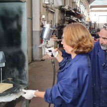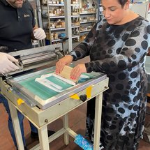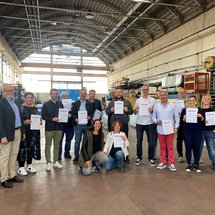 On the second day, the participants went into practice at AIGLE Macchine SRL. The flocking of various materials was demonstrated and tried out. As a highlight, each participant was allowed to flock their own participant certificate. This was great fun for everyone! After a joint lunch, a very successful Flock School closed with enthusiastic participants and instructors. It showed once again how extensive the topic "flock" is and that this important training in the association can give very extensive knowledge for people interested in flock, new employees and customers.